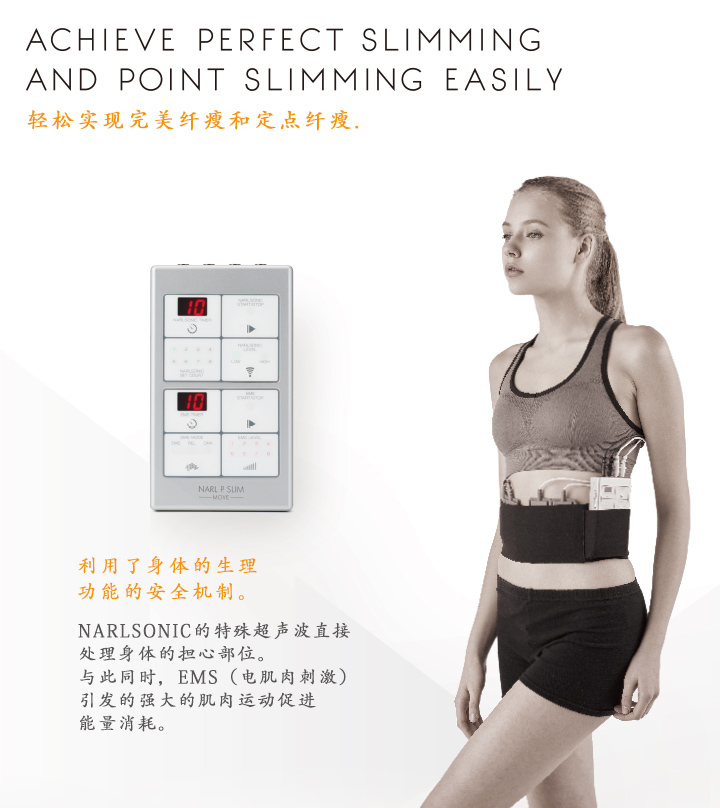 NARLSONIC是指517kHz超低频带的特殊微弱超声波,只需照射担心的部位,无需经过脑信号就能让局部分泌出去甲肾上腺素,从而实现了迄今为止被认为不可能的担心部位的定点纤瘦的医学美容技术。与EMS同时使用后,进一步提高痩身效果。