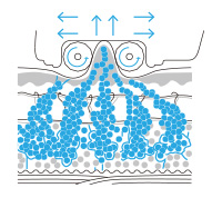 引き上げられた皮膚をローラーが巻き込み、あらゆる方向から肌深部のデコボコをトリートメントしていきます。同時にEMSの刺激により代謝を促します。